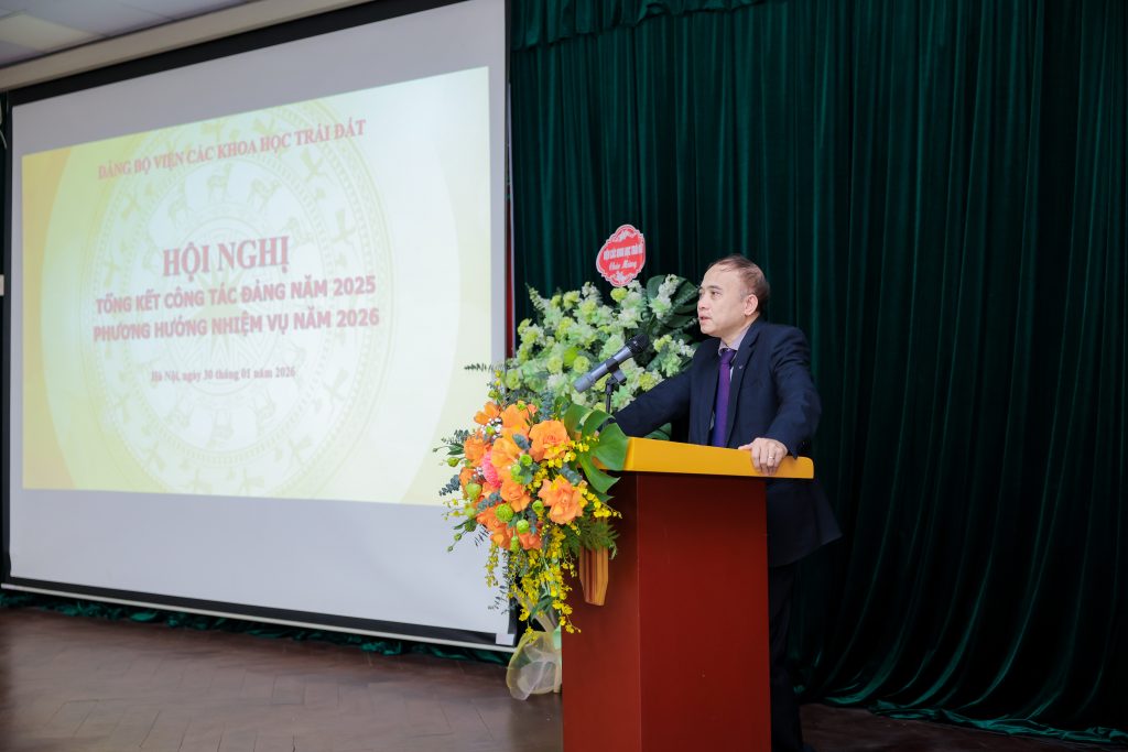 Đ/c Nguyễn Xuân Anh – Bí thư Đảng uỷ, Viện trường Viện Các Khoa học Trái đất trình bày báo cáo tổng kết công tác Đảng năm 2025nhiệm vụ giải pháp trọng tâm năm 2026 của Viện Các Khoa học Trái đất