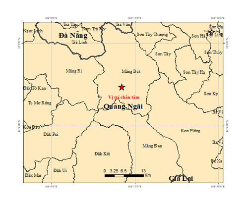 Vào hồi 16 giờ 20 phút 19 giây (giờ GMT) ngày 09 tháng 3 năm 2026, tức 23 giờ 20 phút 19 giây (giờ Hà Nội) ngày 09 tháng 3 năm 2026, một trận động đất có độ lớn M = 3.3 xảy ra tại vị trí có tọa độ 14.868° vĩ Bắc – 108.211° kinh Đông, độ sâu chấn tiêu khoảng 8.1 km. Động đất xảy ra tại khu vực xã Măng Bút, tỉnh Quảng Ngãi. Cấp độ rủi ro thiên tai: 0.