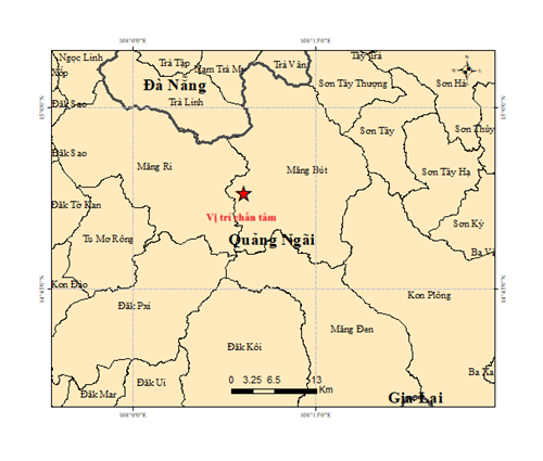 Vào hồi 20 giờ 02 phút 28 giây (giờ GMT) ngày 09 tháng 10 năm 2025 tức 03 giờ 02 phút 28 giây (giờ Hà Nội) ngày 10 tháng 10 năm 2025 một trận động đất có độ lớn 2.7 xảy ra tại vị trí có tọa độ 14.882 độ vĩ Bắc, 108.152 độ kinh Đông), độ sâu chấn tiêu khoảng 8.2 km. Động đất xảy ra tại xã Măng Bút, tỉnh Quảng Ngãi. Cấp độ rủi ro thiên tai cấp 0.