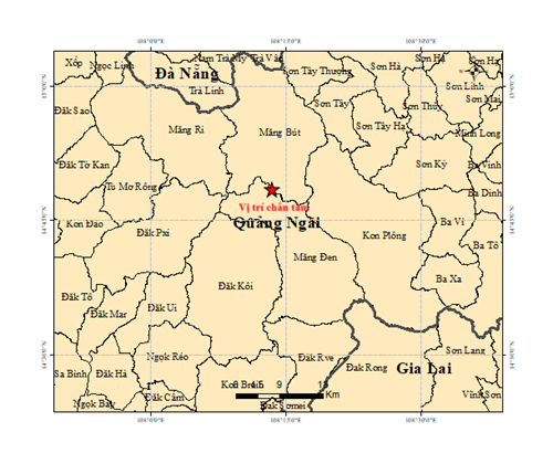 Vào hồi 07 giờ 37 phút 47 giây (giờ GMT) ngày 16 tháng 10 năm 2025 tức 14 giờ 37 phút 47 giây (giờ Hà Nội) ngày 16 tháng 10 năm 2025 một trận động đất có độ lớn 3.0 xảy ra tại vị trí có tọa độ (14.808 độ vĩ Bắc, 108.223 độ kinh Đông), độ sâu chấn tiêu khoảng 8.1 km. Động đất xảy ra tại xã Măng Bút, tỉnh Quảng Ngãi. Cấp độ rủi ro thiên tai cấp 0.