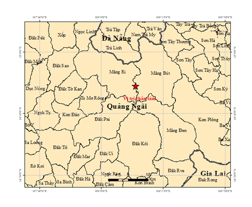 Vào hồi 07 giờ 56 phút 17 giây (giờ GMT) ngày 18 tháng 10 năm 2025 tức 14 giờ 56 phút 17 giây (giờ Hà Nội) ngày 18 tháng 10 năm 2025 một trận động đất có độ lớn 3.3 xảy ra tại vị trí có tọa độ (14.862 độ vĩ Bắc, 108.138 độ kinh Đông), độ sâu chấn tiêu khoảng 8.2 km. Động đất xảy ra tại xã Măng Bút, tỉnh Quảng Ngãi. Cấp độ rủi ro thiên tai cấp 0.