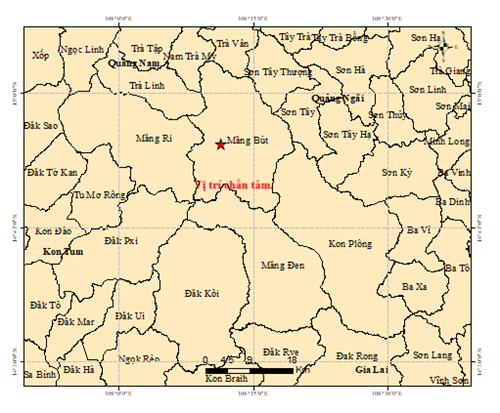 Vào hồi 08 giờ 14 phút 42 giây (giờ GMT) ngày 22 tháng 8 năm 2025 tức 15 giờ 14 phút 42 giây (giờ Hà Nội) ngày 22 tháng 8 năm 2025 một trận động đất có độ lớn 2.5 xảy ra tại vị trí có tọa độ (14.907 độ vĩ Bắc, 108.190 độ kinh Đông), độ sâu chấn tiêu khoảng 8.2 km. Động đất xảy ra tại xã Măng Bút, tỉnh Quảng Ngãi. Cấp độ rủi ro thiên tai cấp  0.