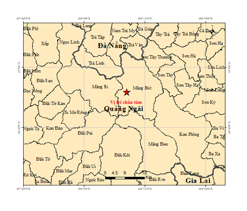 Vào hồi 22 giờ 54 phút 15 giây (giờ GMT) ngày 23 tháng 10 năm 2025 tức 05 giờ 54 phút 15 giây (giờ Hà Nội) ngày 24 tháng 10 năm 2025 một trận động đất có độ lớn 2.8 xảy ra tại vị trí có tọa độ (14.897 độ vĩ Bắc, 108.176 độ kinh Đông), độ sâu chấn tiêu khoảng 8.1 km. Động đất xảy ra tại xã Măng Bút, tỉnh Quảng Ngãi. Cấp độ rủi ro thiên tai cấp 0.