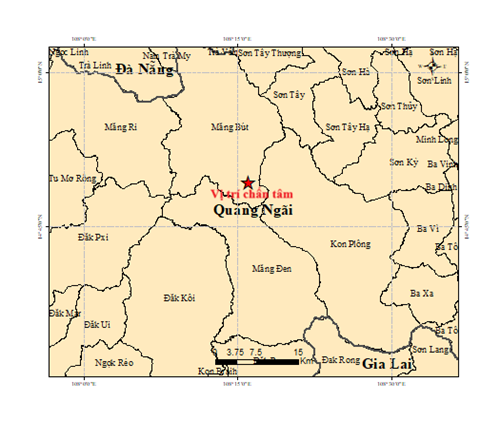 Vào hồi 10 giờ 04 phút 10 giây (giờ GMT) ngày 29 tháng 4 năm 2026, tức 17 giờ 04 phút 10 giây (giờ Hà Nội) ngày 29 tháng 4 năm 2026, một trận động đất có độ lớn M = 3.3 xảy ra tại vị trí có tọa độ 14.820° vĩ Bắc – 108.268° kinh Đông, độ sâu chấn tiêu khoảng 8.1 km. Động đất xảy ra tại khu vực xã Măng Bút, tỉnh Quảng Ngãi. Cấp độ rủi ro thiên tai: 0.