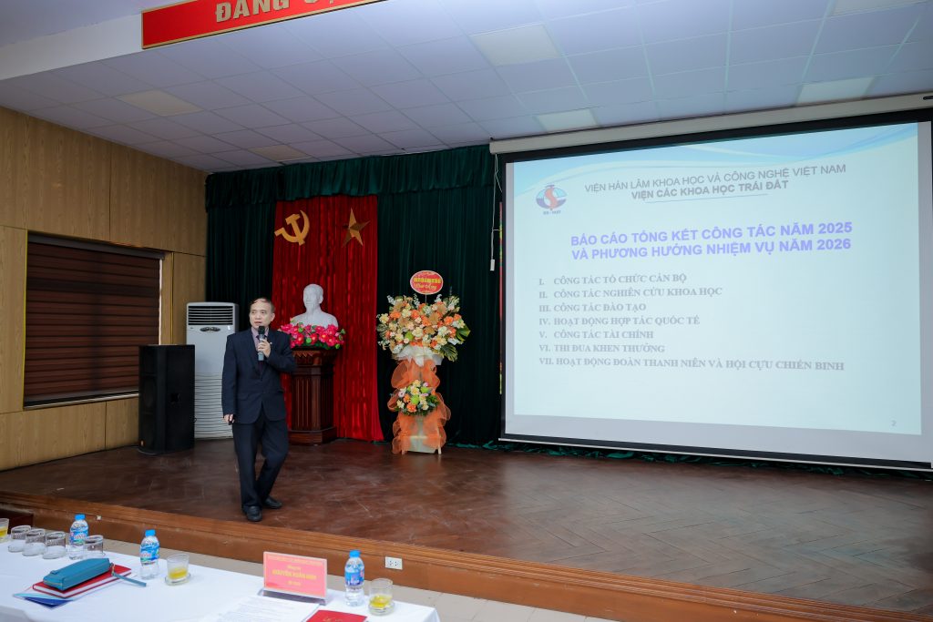 TS.Nguyễn Xuân Anh – Viện trưởng Viện Các Khoa hoc Trái đất trình bày báo cáo tại hội nghị tổng kết công tác năm 2025 và triển khai kế hoạch năm 2026 của Viện Các Khoa học Trái đất